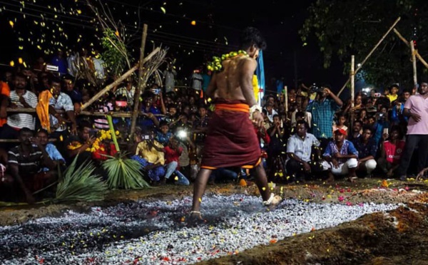 Theemithi ou "marche sur le feu" se déroule dans le cadre d'un vœu religieux dans lequel le dévot promet de marcher sur le feu en échange d'un souhait ou d'une bénédiction accordée par la déesse...